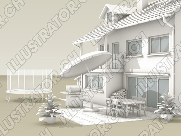 Tags: 3D Haus Gebäude technisch Visualisierung Einfamilienhaus Sitzplatz Terrasse Garten Trampolin Sonnenschirm