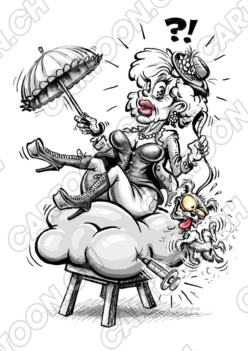 Tags: Schwarzweiss Helgen Schnitzelbank Cartoon Hund Stuhl Botox Kissen Aristokratin