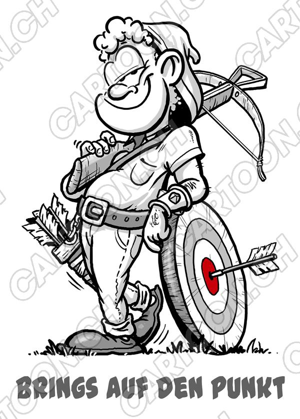 Tags: Visualisierung Character Figur schwarz weiss schwarzweiss Cartoon Mann Comic Typ Comicfigur Wilhelm Tell leitsatz DNA Motto Armbrust schiessen Tell Ziel Zielen Zielscheibe Treffer Bolzen Punkt Brings auf den Punkt